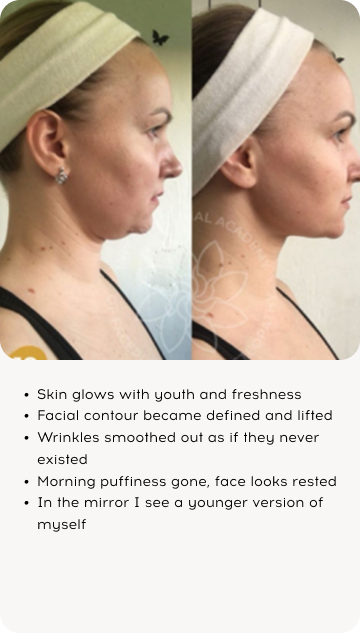 "Face yoga — results last an hour. Here the effect lasts all day." — Patricia, 57