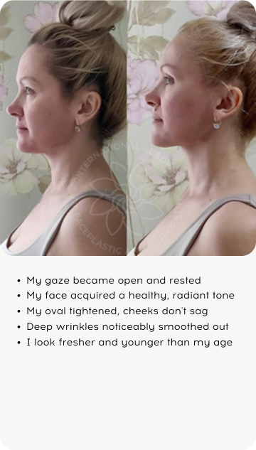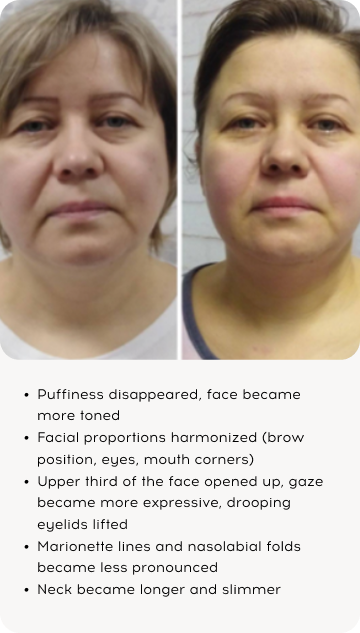 Lifted cheekbones, reduced nasolabial folds, no dark circles, younger-looking face