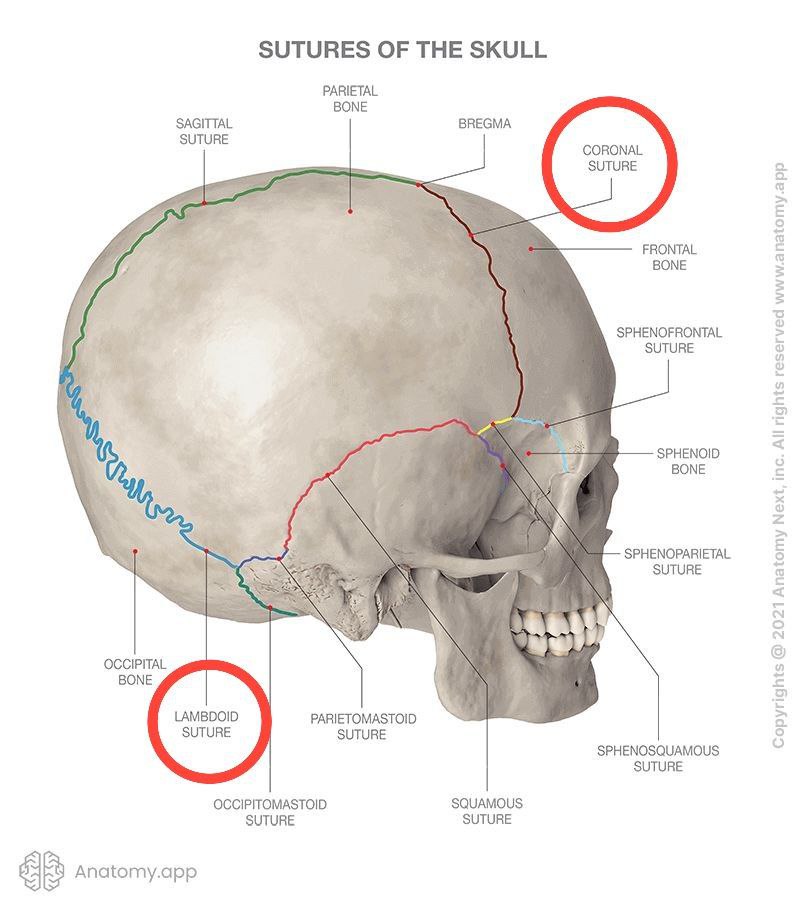 ➡️ Cranial sutures are filled with the same connective tissue as muscles, fascia. In some sutures, the bones overlap each other like scales or shingles. This structure protects the brain from outside influences.