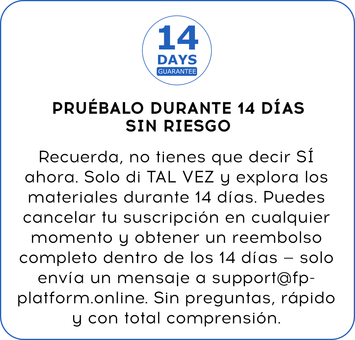 Recuerda, no tienes que decir SÍ ahora. Solo di TAL VEZ y explora los materiales durante 14 días. Puedes cancelar tu suscripción en cualquier momento y obtener un reembolso completo dentro de los 14 días — solo envía un mensaje a support@fp-platform.online. Sin preguntas, rápido y con total comprensión.