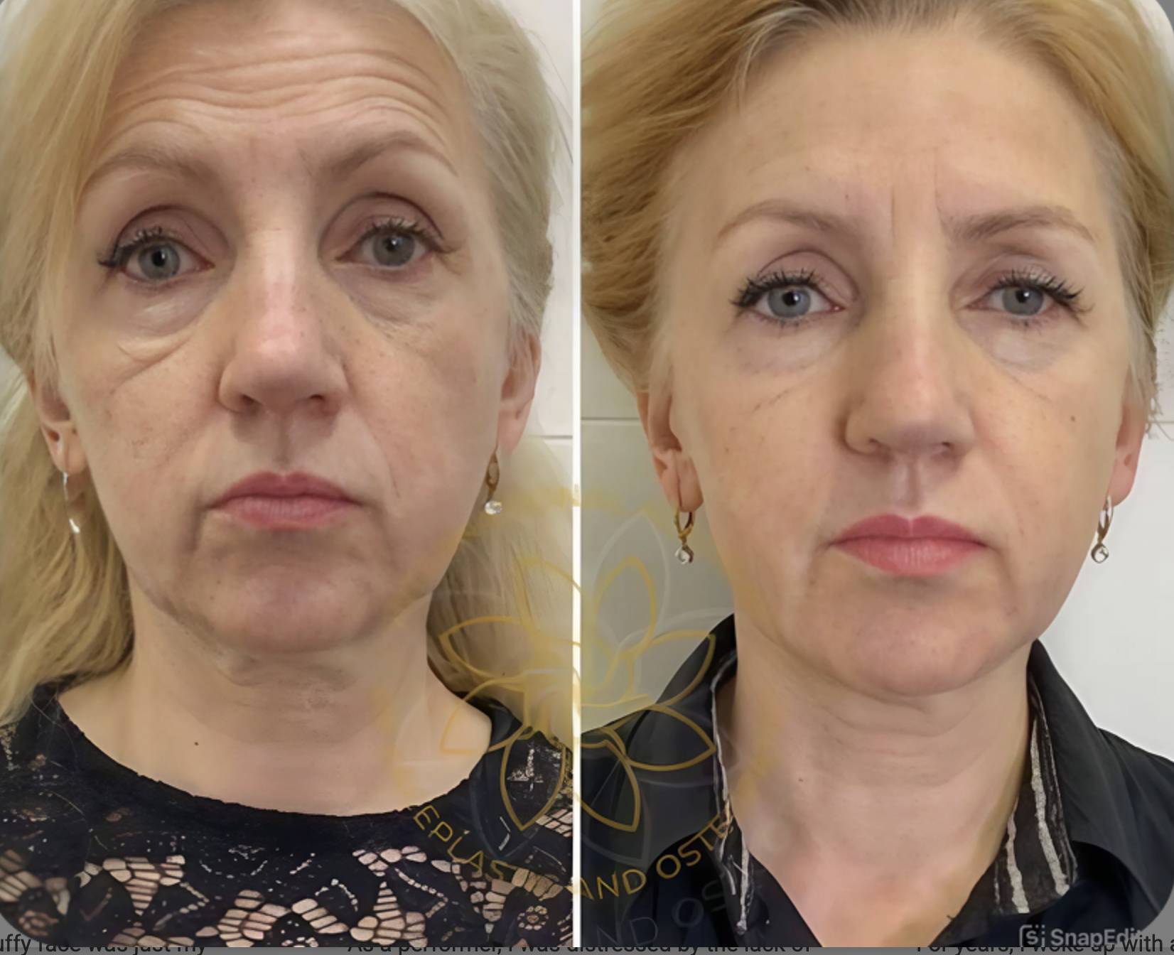 ✅ A visibly lifted, slimmer face with a sharp, defined jawline.