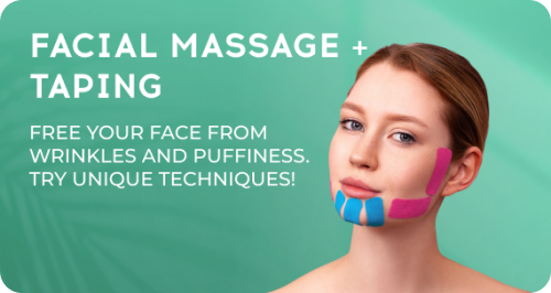 Self-massage and taping for smoothing wrinkles and relieving puffiness.