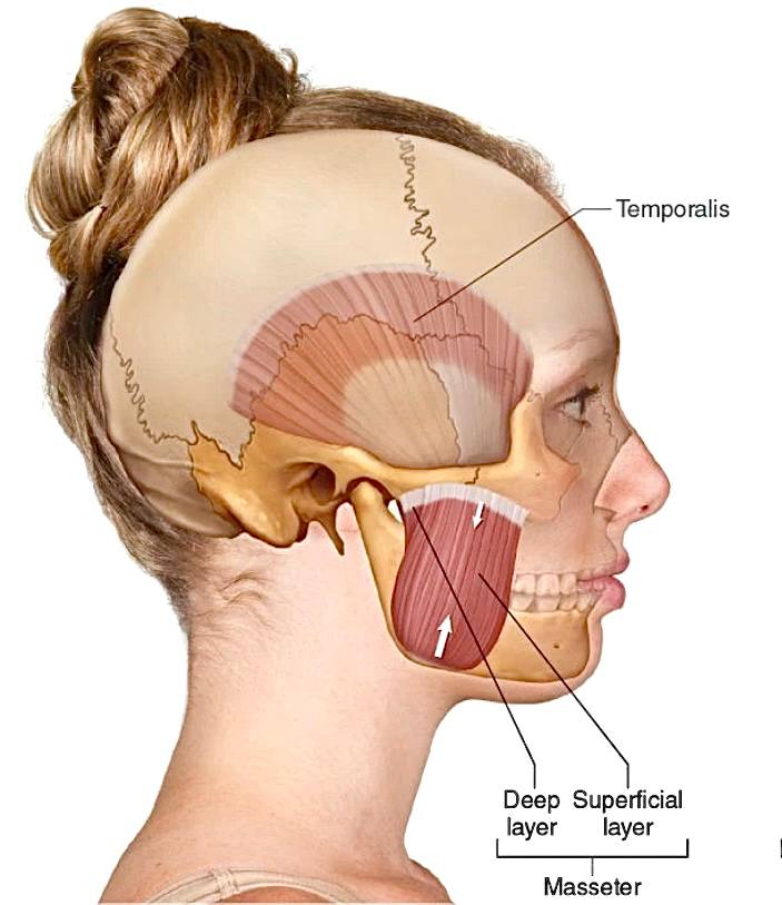 Place your thumbs under the cheek bones (where the masseter muscles are attached).